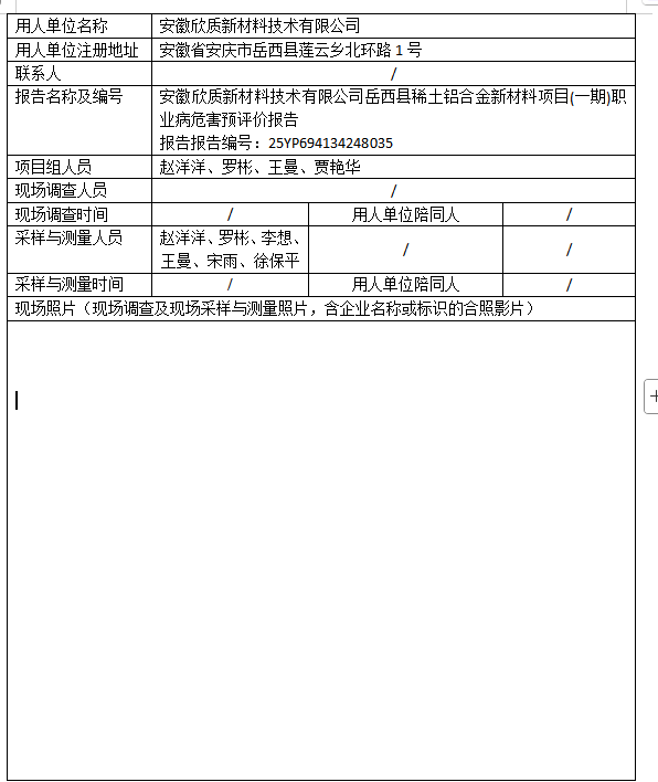 安徽欣质新材料技术有限公司岳西县稀土铝合金新材料项目(一期)职业病危害预评价报告