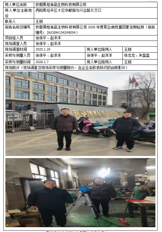 安徽黑娃食品生物科技有限公司2026年度职业病危害因素定期检测