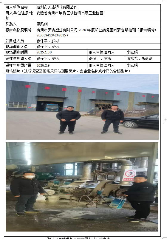 宿州市天洁塑业有限公司2026年度职业病危害因素定期检测