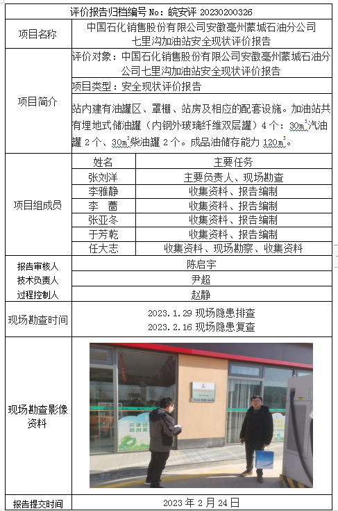 中国石化销售股份有限公司安徽亳州蒙城石油分公司 七里沟加油站安全现状评价报告