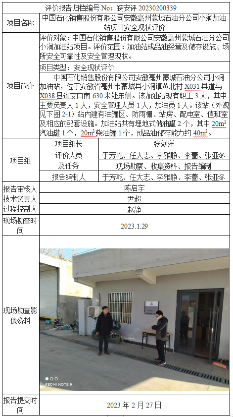 中国石化销售股份有限公司安徽亳州蒙城石油分公司小涧加油站项目安全现状评价
