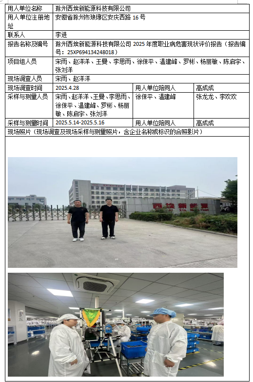 滁州西埃新能源科技有限公司2025年度职业病危害现状评价报告(报告编号:25XP694134248018)