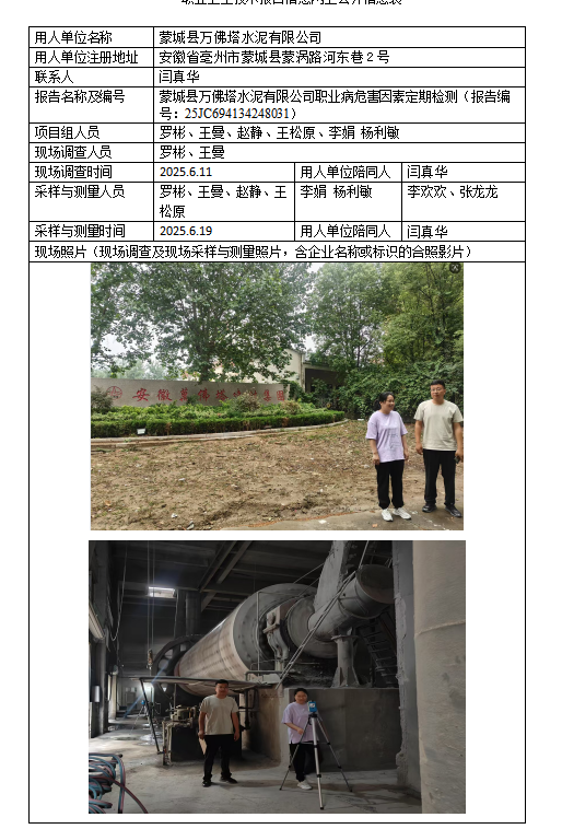 蒙城县万佛塔水泥有限公司职业病危害因素定期检测(报告编号:25JC694134248031)