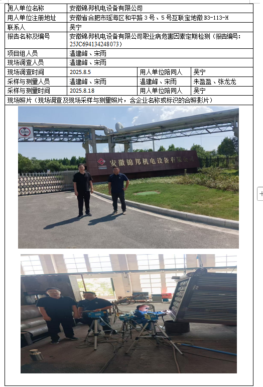 安徽锦邦机电设备有限公司职业病危害因素定期检测(报告编号:25JC694134248073)