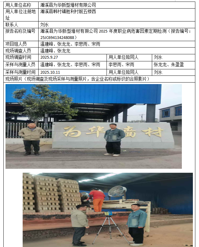 濉溪县为华新型墙材有限公司2025年度职业病危害因素定期检测