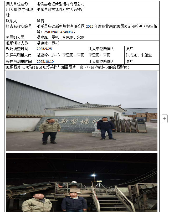 濉溪县启硕新型墙材有限公司2025年度职业病危害因素定期检测