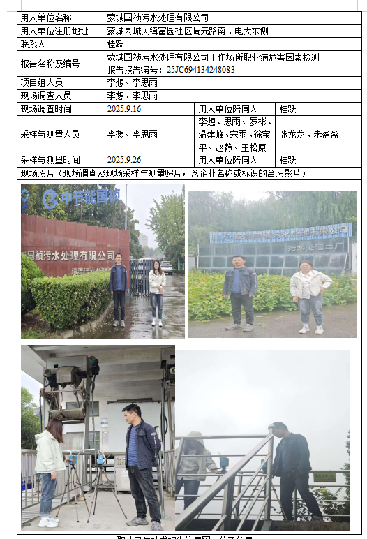 蒙城国祯污水处理有限公司工作场所职业病危害因素检测